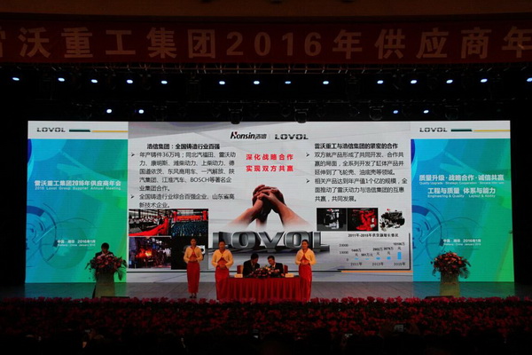 1月3日-4日,以“質量升級?戰略合作?誠信共贏,工程與質量,體系與能力”為主題的雷沃重工集團2016年供應商年會在濰坊隆重召開,雷沃重工集團董事長、總經理王桂民,黨委書記梁啟榮,執行總經理王玉榮及公司經營管理團隊出席會議,來自全國的720多家供應商1000多人參加會議,浩信集團董事長呂繼賢及營銷公司總經理金振偉應邀參加本次年會。雷沃重工集團是一家以大型產業裝備為主導業務、以工程機械、農業裝備、車輛三大業務為主體的大型股份制企業,2015年實現銷售收入215億元,品牌價值達到335.56億元,產品質量及銷量連續多年居行業首位。